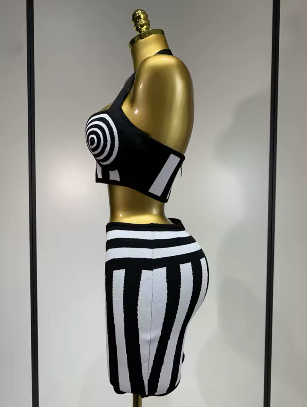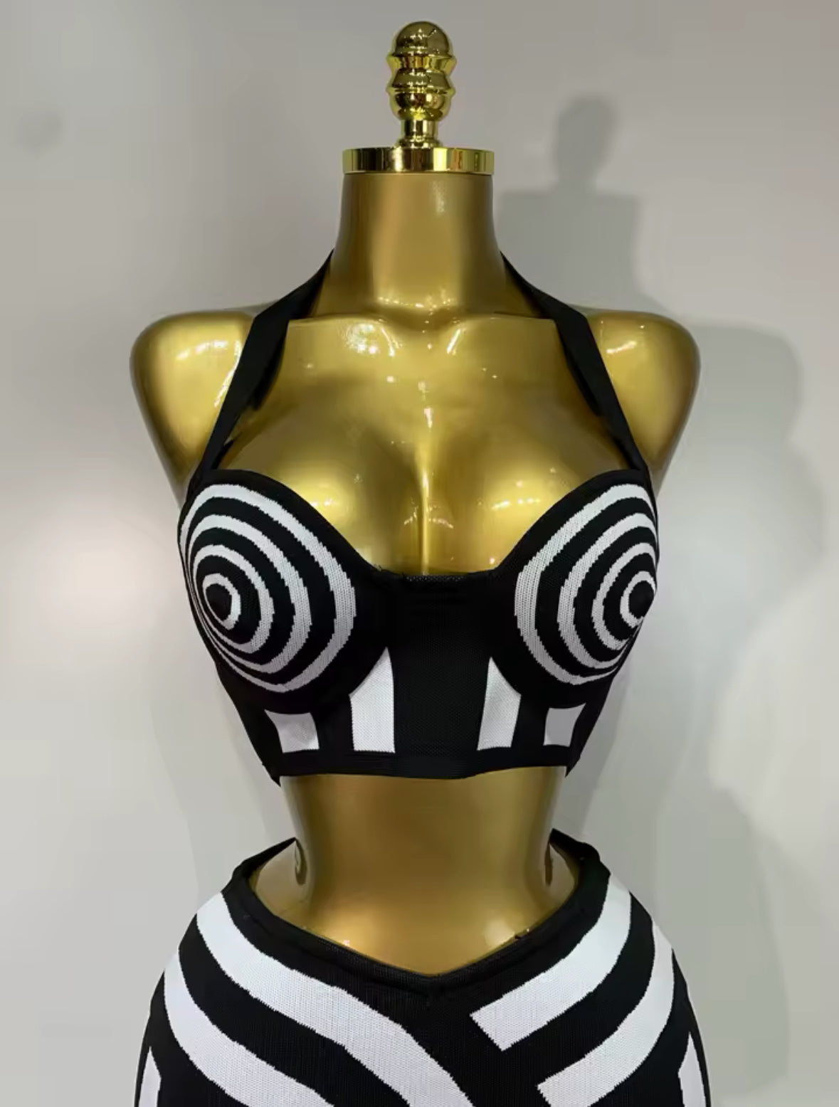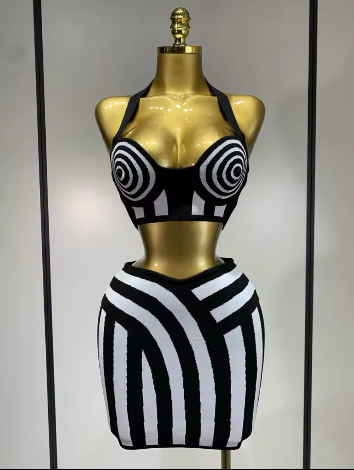 This sculpting two-piece features a halter-style crop top with dramatic spiral cup detailing and a body-contouring high-waist mini skirt that carves out your curves with precision. Designed in a striking black and white pattern, this set is engineered to snatch your waist and elevate your silhouette—perfect for nightlife, fashion-forward events, or making a statement on the gram.