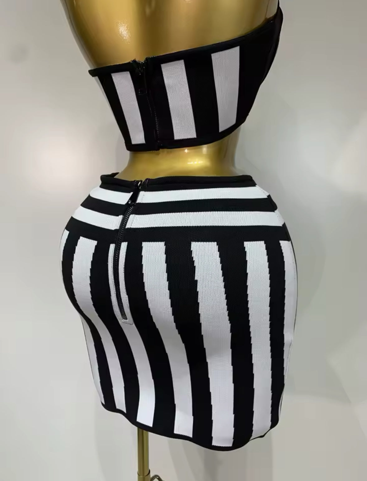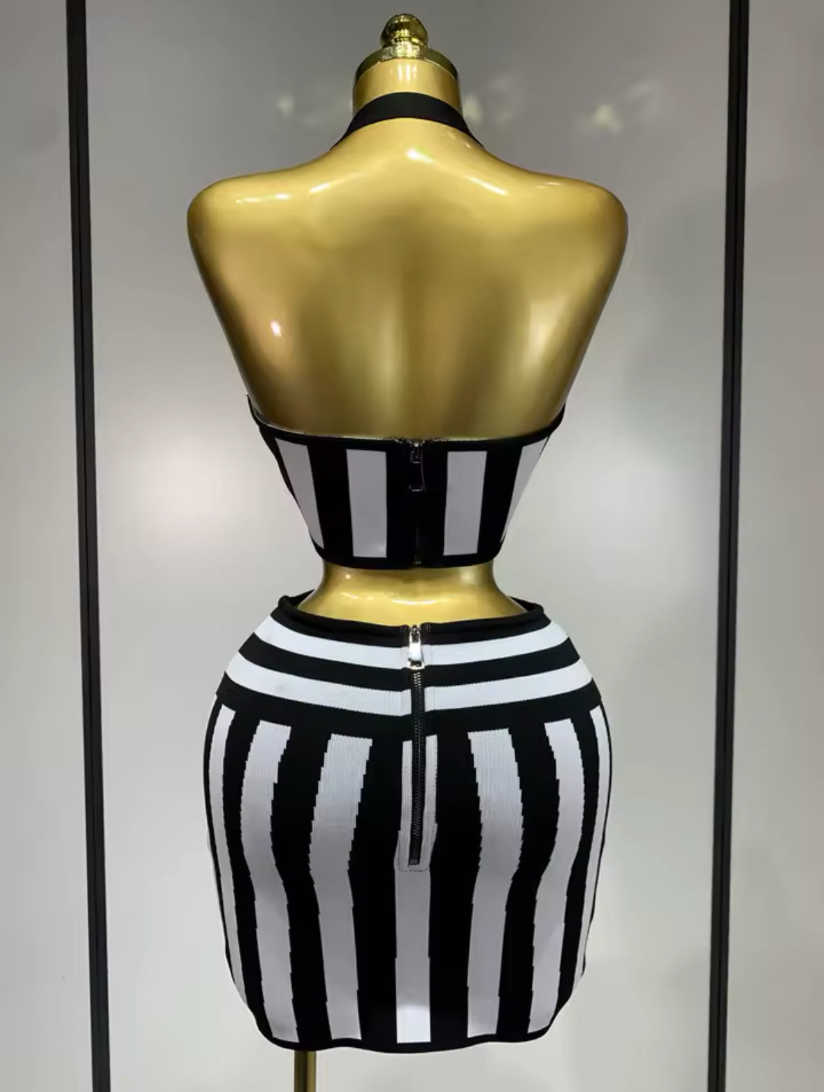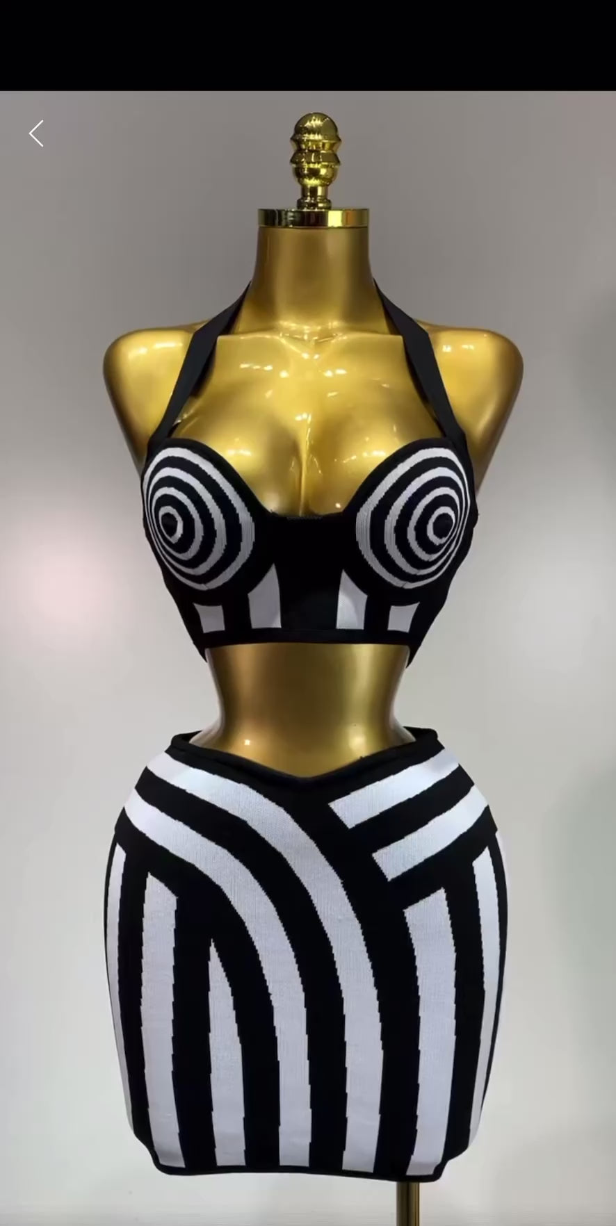 This sculpting two-piece features a halter-style crop top with dramatic spiral cup detailing and a body-contouring high-waist mini skirt that carves out your curves with precision. Designed in a striking black and white pattern, this set is engineered to snatch your waist and elevate your silhouette—perfect for nightlife, fashion-forward events, or making a statement on the gram.