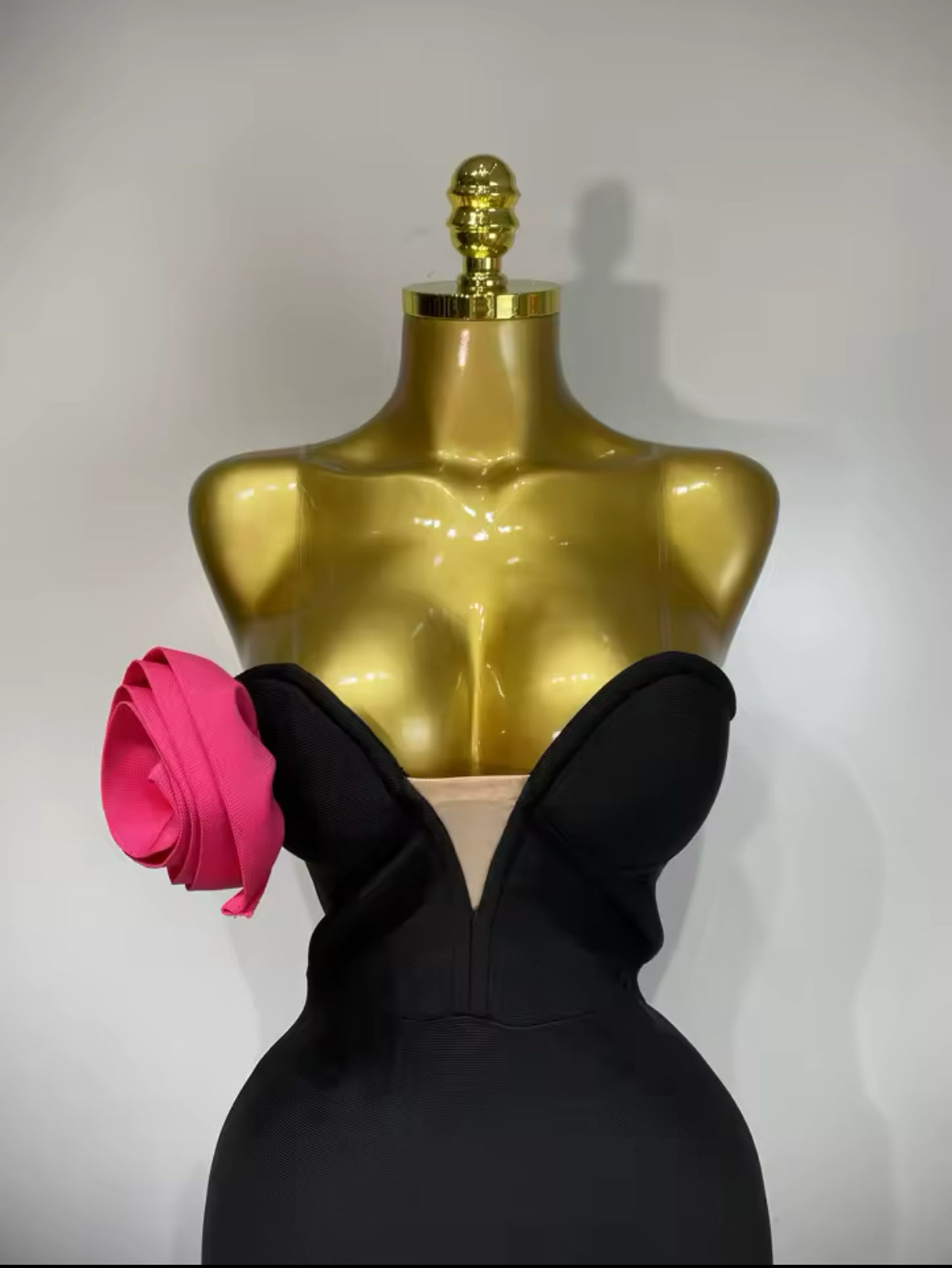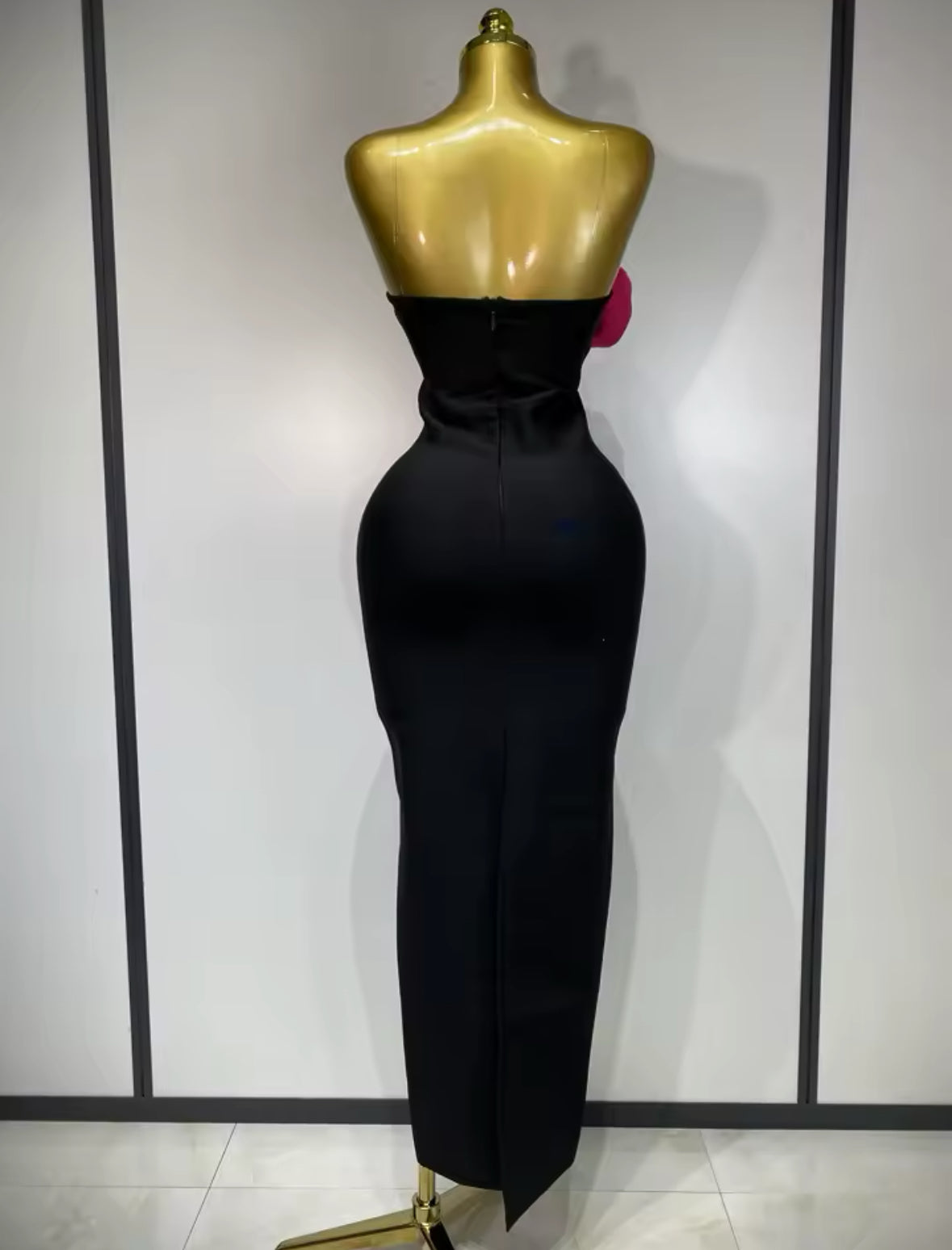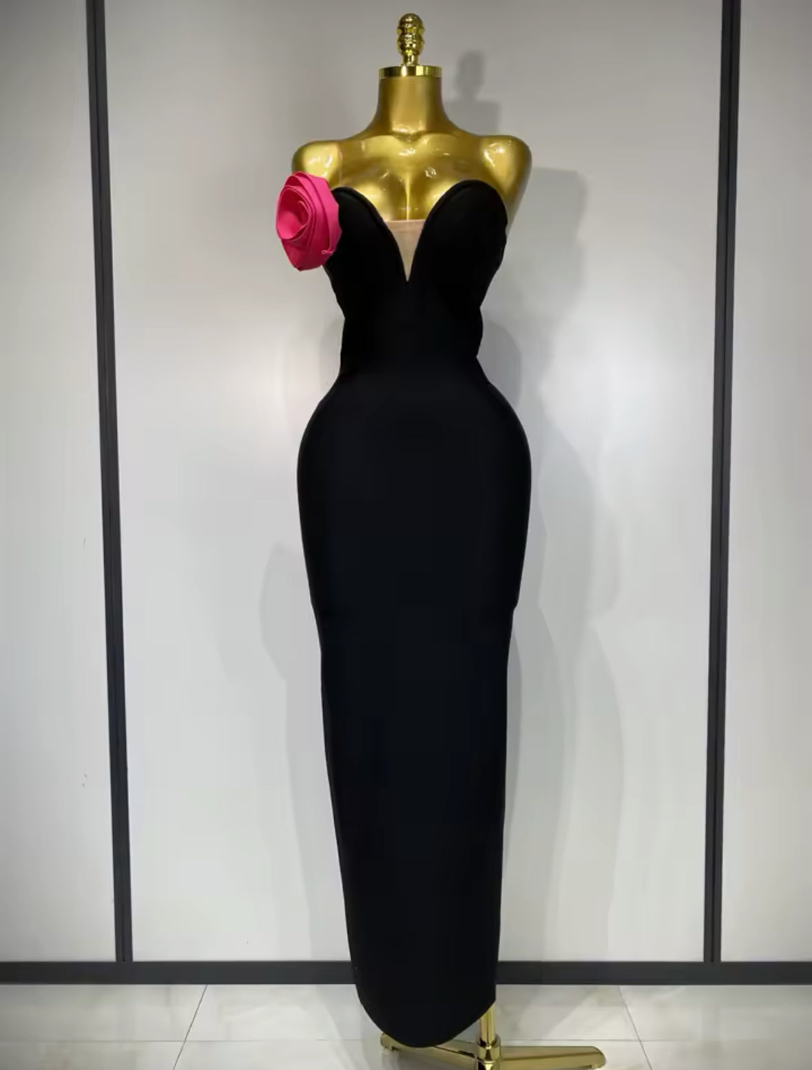 Turn heads and command every room in our Sculpted Elegance Bandage Gown. This luxurious strapless black dress features a curve-contouring bandage fabric that hugs your body like a second skin, enhancing your natural shape. The structured sweetheart neckline is beautifully accented with a bold 3D pink rose detail, adding just the right touch of drama and femininity.