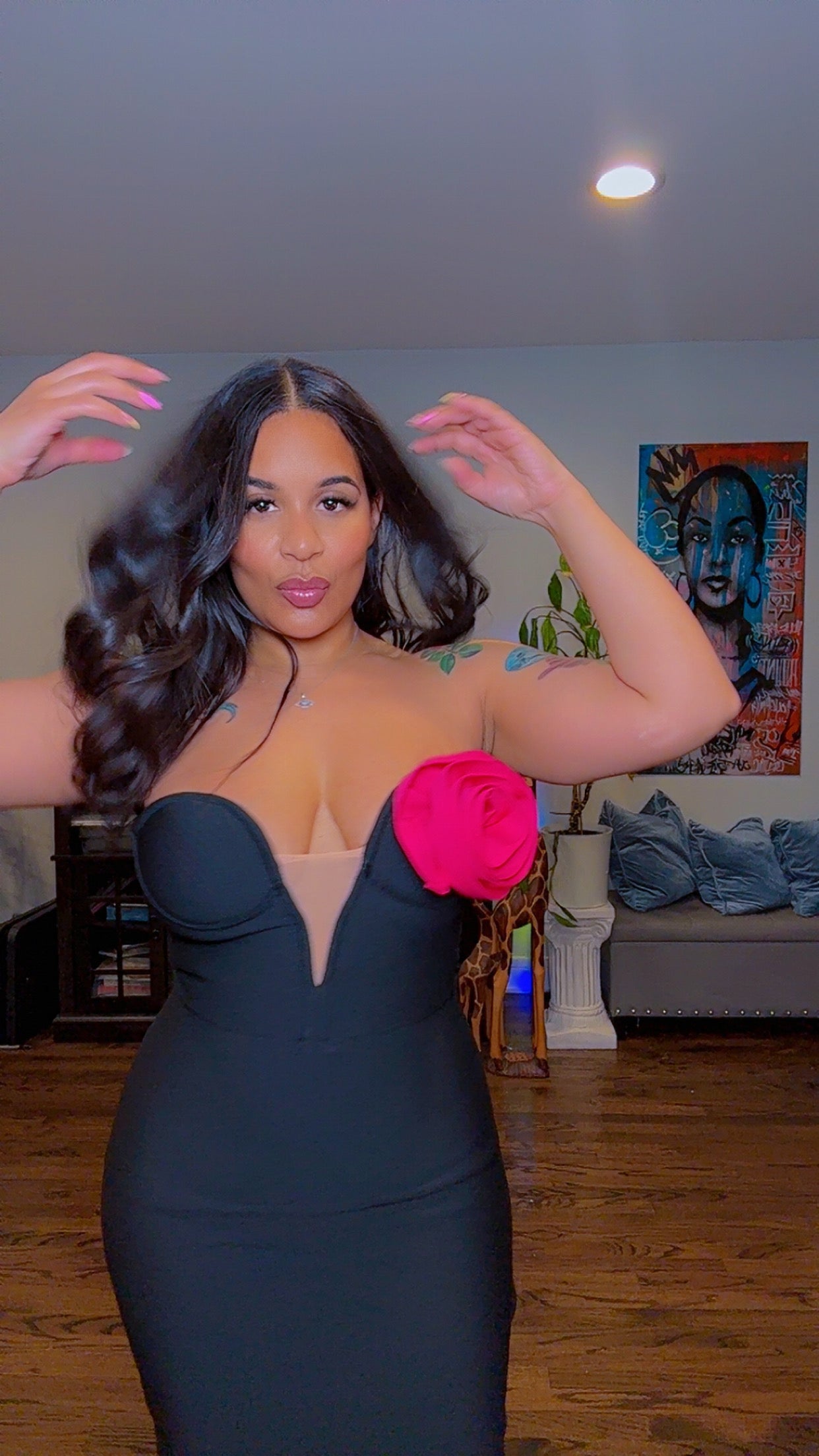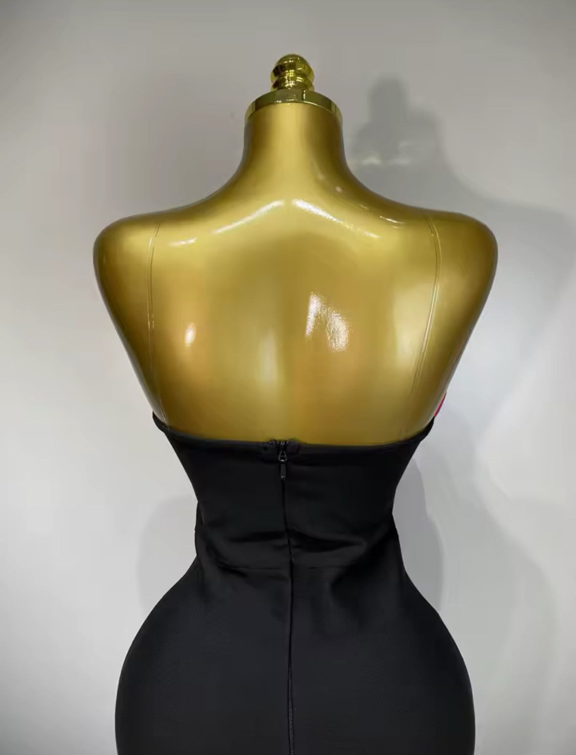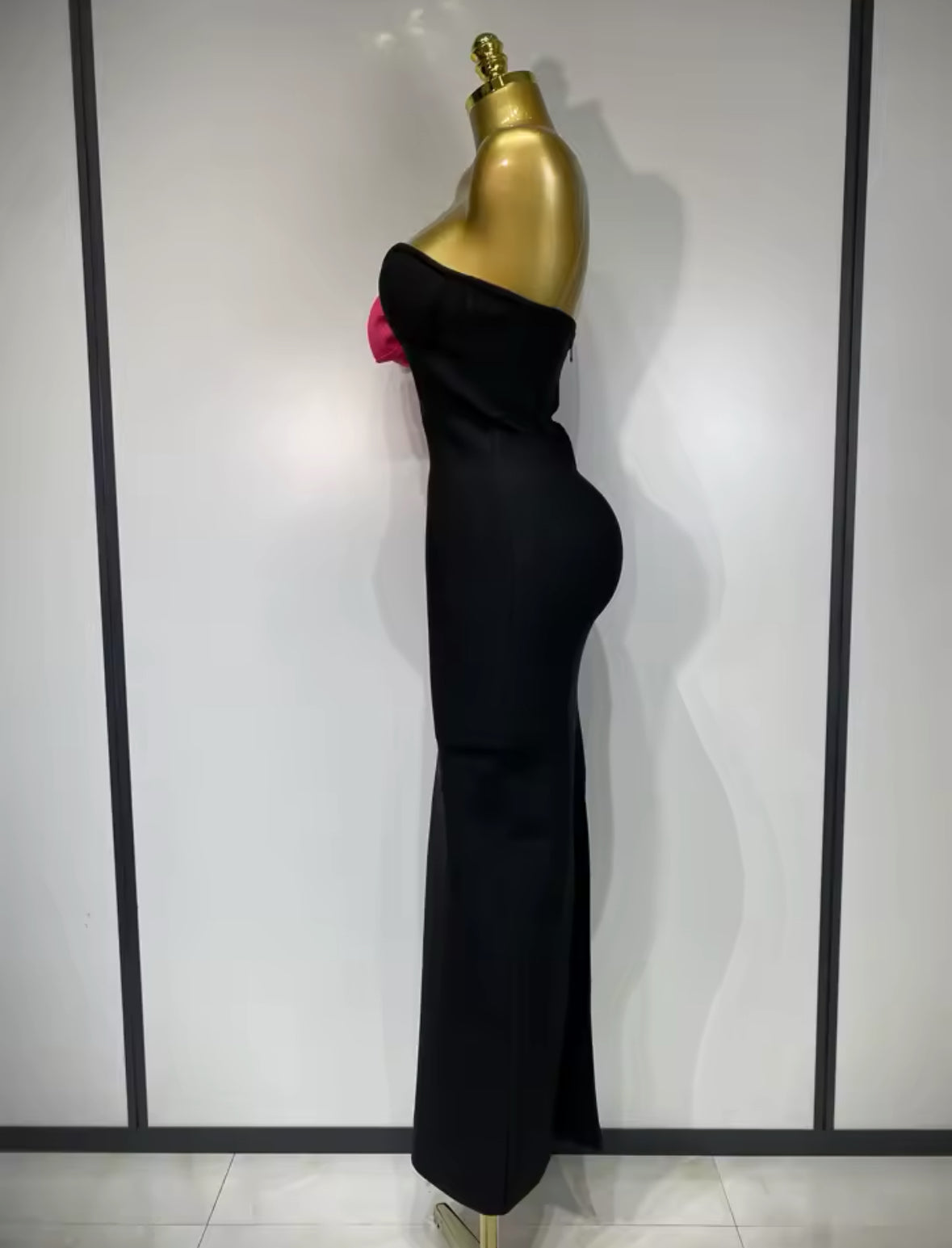 Turn heads and command every room in our Sculpted Elegance Bandage Gown. This luxurious strapless black dress features a curve-contouring bandage fabric that hugs your body like a second skin, enhancing your natural shape. The structured sweetheart neckline is beautifully accented with a bold 3D pink rose detail, adding just the right touch of drama and femininity.
