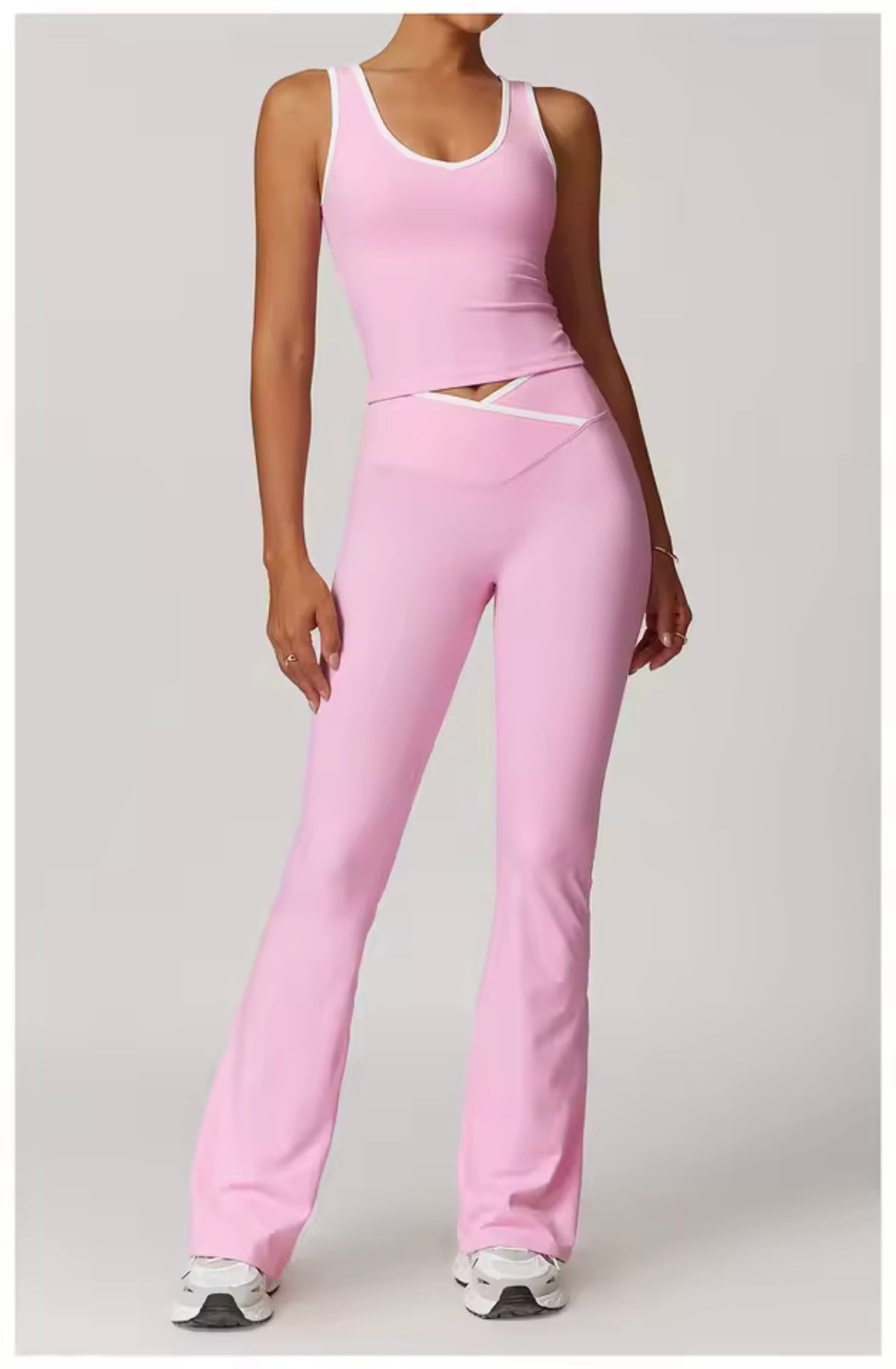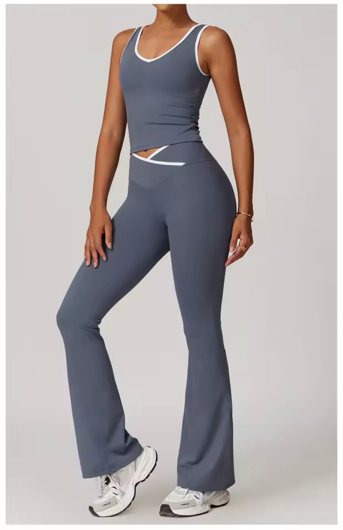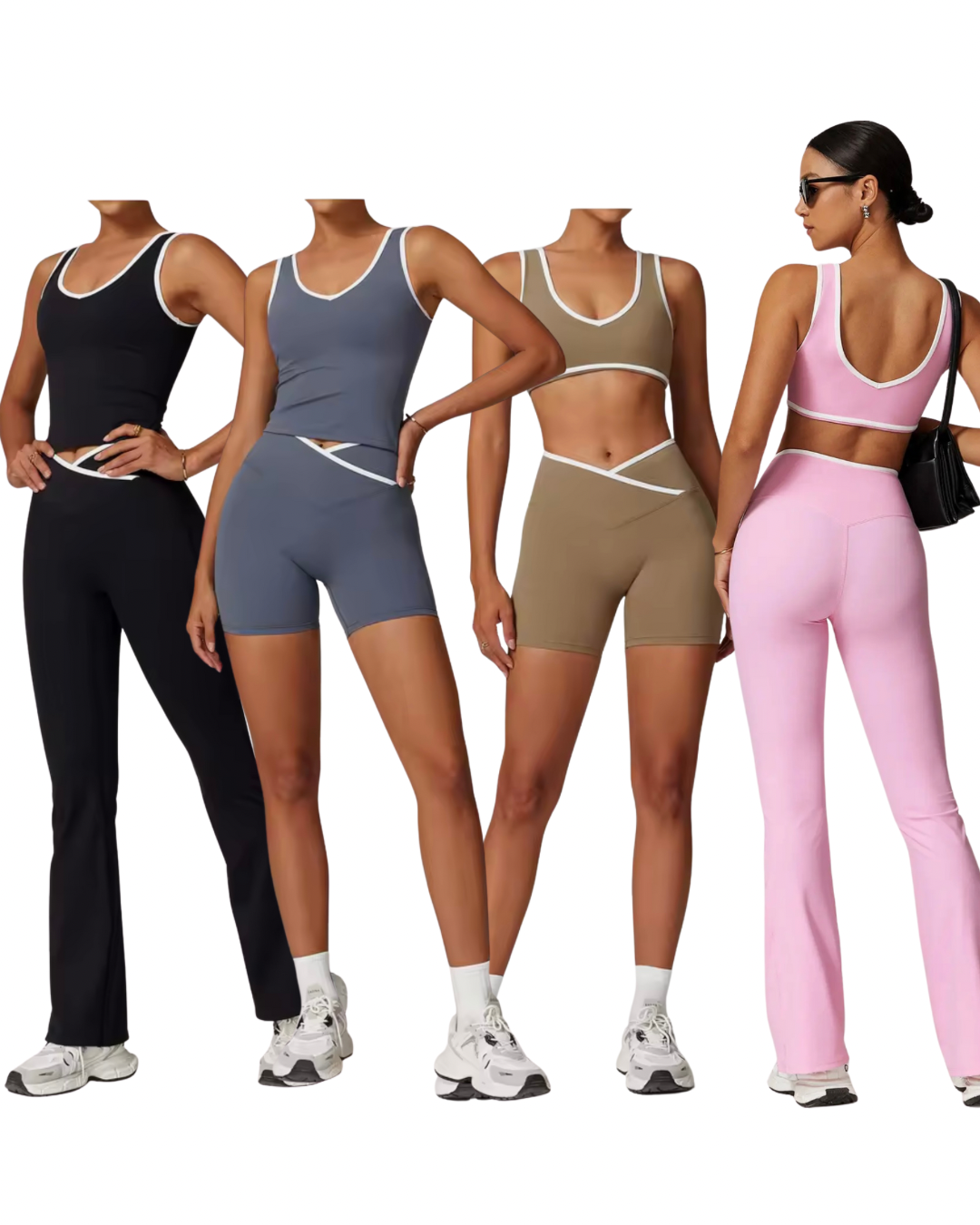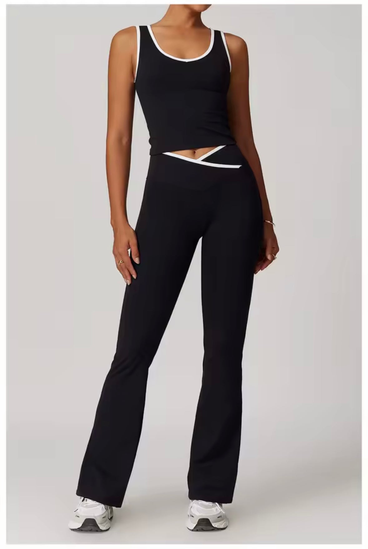 Crafted from buttery-soft, stretchy fabric, the set provides a second-skin feel with maximum comfort. The flattering cross-waistband detail sculpts your core while the contrast trim adds a chic, city-girl edge. Available in both full-length flared pants and biker shorts, plus matching crop tops and tanks, you can mix and match for every mood and activity.