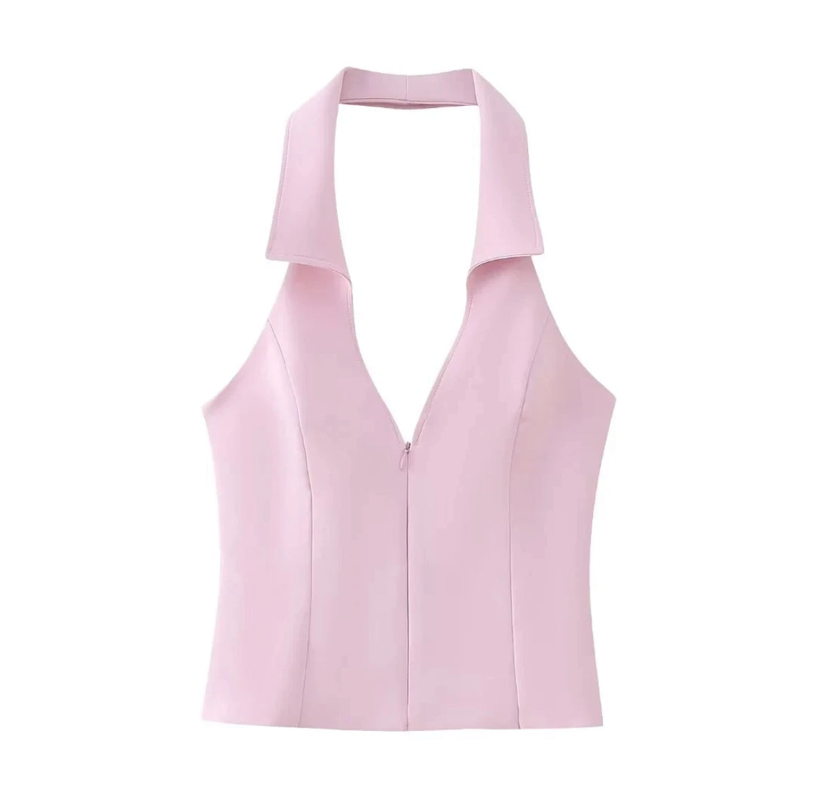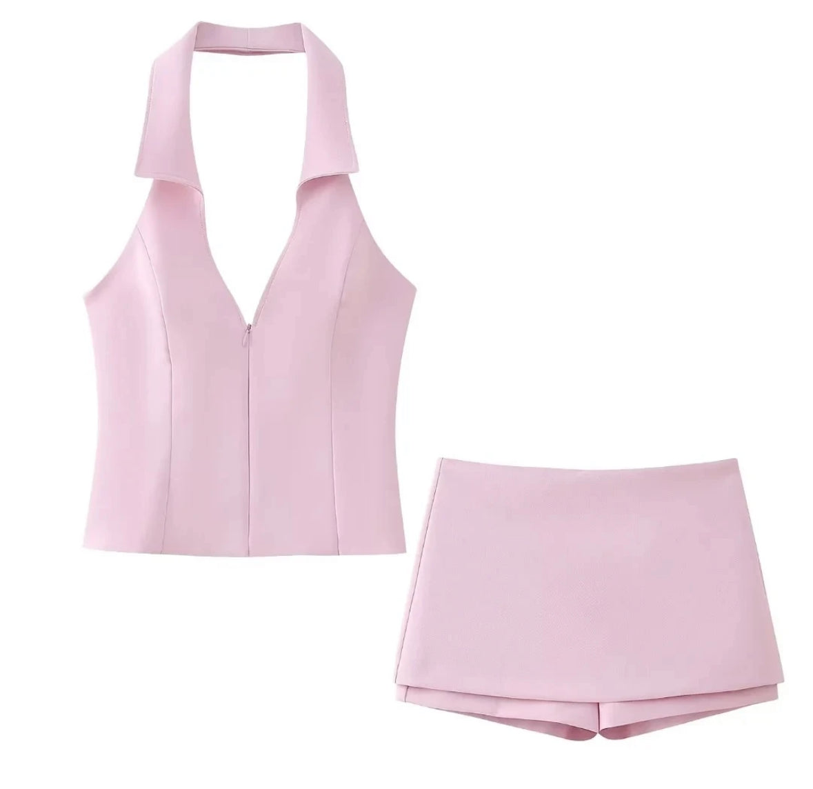 - Design: The top features a halter neckline with a sleek zipper front, offering a contemporary and sophisticated look. The matching skort combines the feminine charm of a skirt with the practicality of shorts.